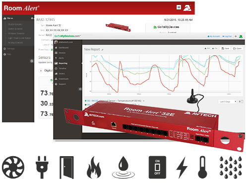 - Monitors Temperature, Humidity, Power, Flood / Water, Smoke / Fire, Motion, Room Entry, Air Flow, Panic Buttons, Network Cameras and more.