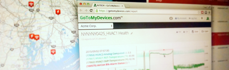 GoToMyDevices is AVTECH's state of the art cloud service that allows users to easily manage and monitor Room Alert temperature and environment conditions, create custom reports for temperature logging or enviroment sensor logging history, receive alert notifications when environment conditions reach extremes, view a map showing environment conditions in remote facilities and much, much more. This powerful service allows access from any browser or mobile device over the web with the same user experience device to device. With no software to install, configure or manage, GoToMyDevices makes it easier than ever to get started monitoring your most important assets.